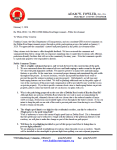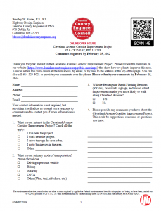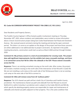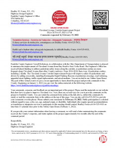 A “request for public comment” was sent in four different languages to 1021 area residents and businesses regarding the improvement of Agler Road over Alum Creek. Comments were received until October 12, 2020. All responses were mailed back in January 2021.
