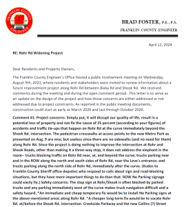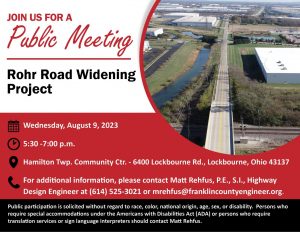 A public meeting will be held on Wednesday, August 9, 2023, at 5:30 pm to discuss the Rohr Road Widening Improvement Project.