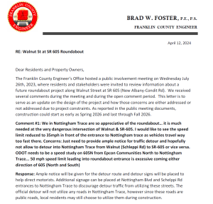 The meeting will be held at the Brown Township Office located at 2491 Walker Road, Hilliard, OH 43026 with a formal presentation. Personnel representing the Franklin County Engineer’s Office will be available to discuss the project and any concerns you may have.