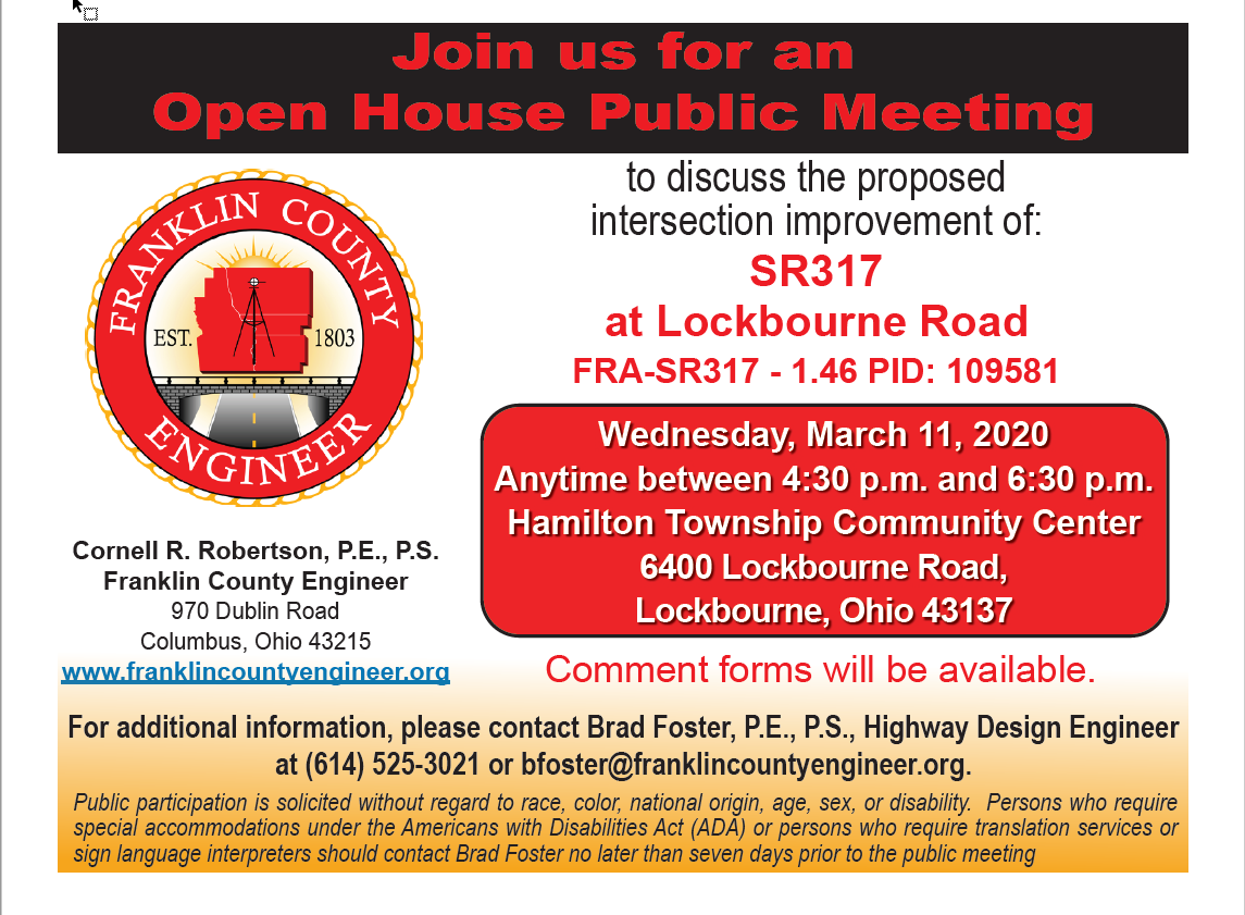 A public meeting will be held on Wednesday, March 11, 2020 from 4:30 pm to 6:30 pm to discuss the proposed improvement of SR317 at Lockbourne Road.