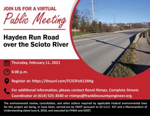 A public meeting will be held on Thursday, February 11 at 6:00 pm to discuss the proposed improvement of Hayden Run Road over the Scioto River.