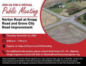 A public meeting will be held on Thursday, November 12 from 6:00 pm to 7:00 pm to discuss the proposed improvement of Norton Road at Kropp Road and Grove City Road.