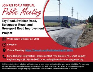 A public meeting will be held on Wednesday, October 13 at 6:00 pm to discuss the Toy Road, Swisher Road, Saltzgaber Road, and Groveport Road Improvement Project.