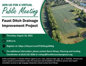 A public meeting will be held on Thursday, August 18, 2022, at 6:00 pm to discuss the Faust Ditch Drainage Improvement Project.