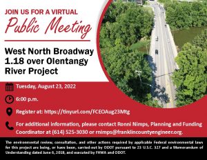A public meeting will be held on Tuesday, August 23, 2022, at 6:00 pm to discuss the West North Broadway 1.18 over Olentangy River Improvement Project.