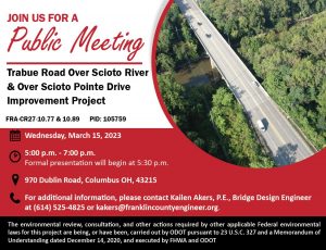 A public meeting will be held on Wednesday, March 15, 2023, at 5:30 pm to discuss the Trabue Road Over Scioto River & Over Scioto Pointe Drive Improvement Project.