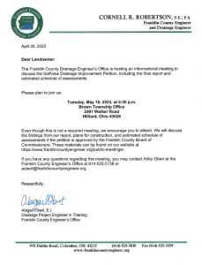 A public informational meeting will be held on Tuesday, May 16, 2023, at 6:30 pm to discuss the Golfview Drainage Improvement Petition.