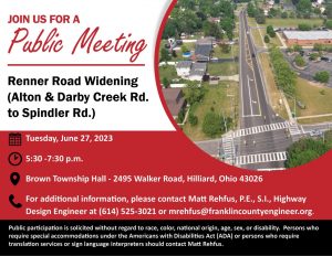 The meeting will be held at Brown Township Hall (2495 Walker Road, Hilliard, Ohio 43026) with a formal presentation. Personnel representing the Franklin County Engineer’s Office will be available to discuss the project and any concerns you may have.