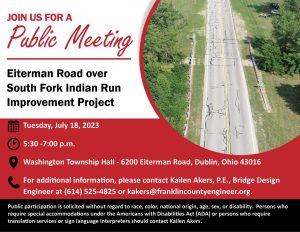 A public meeting will be held on Tuesday, July 18, 2023, at 5:30 pm to discuss the Eiterman Road over South Fork Indian Run Improvement Project.