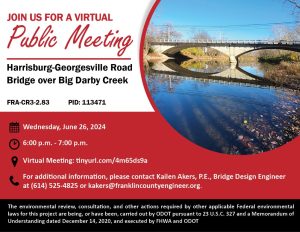 A public meeting will be held on Wednesday, June 26, 2024, at 6:00 pm to discuss the Harrisburg-Georgesville Road Bridge Over Big Darby Creek Project.